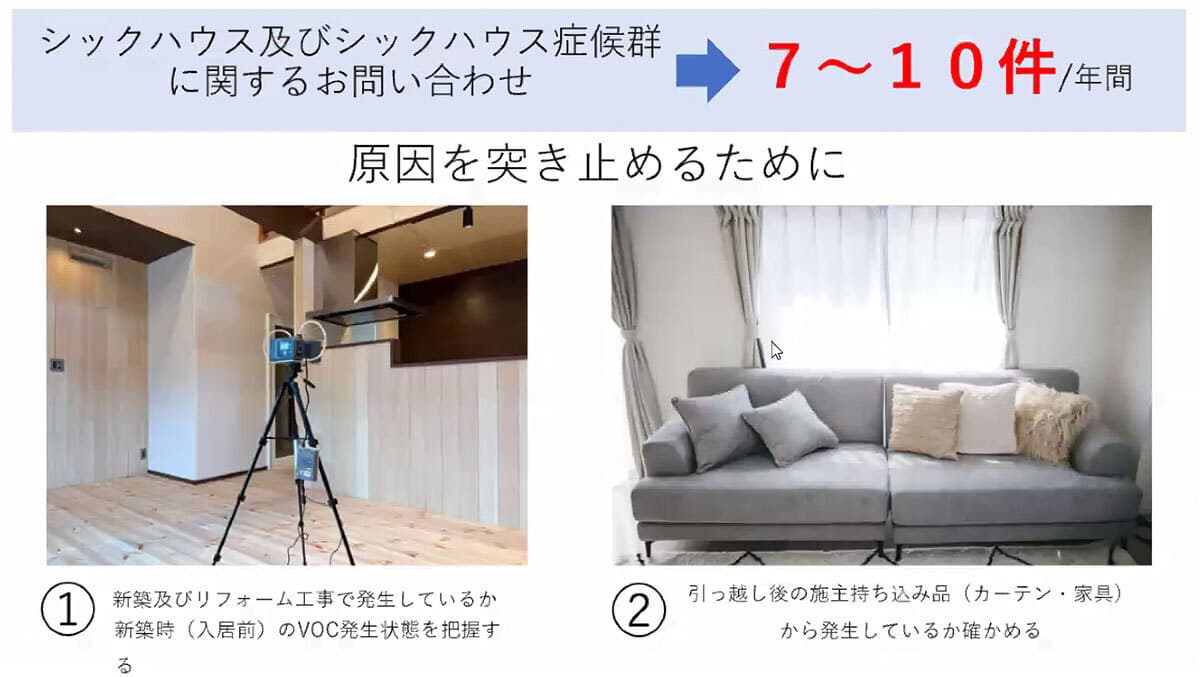 ![]() VOCが指針値をオーバーした時の対策 工務店は住まい手の命守る責任大きい 澤田氏は、「新築でもリフォームでも完成時点でのVOC濃度を確認しておくことが一番大事。VOC測定は1件7~10万円かかるが、工務店は一般消費者の買い物として一番高いものを造って引き渡すので、住まい手の命を守る責任も大きい。住宅価格が高騰している中、少しでもコストは抑えたいが、VOC測定を全棟標準にして固定費と一緒に原価に含めてしまう方法もあるので検討してみてはどうか」と、工務店としてVOC測定を行う意義を強調。